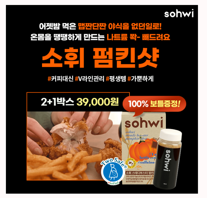 맵고 짠 음식 맘껏드세요- 나트륨 쫙 빼드려요. 어제 먹은 야식 없던일로 죄책감 갖지 말고 커피대신 가뿐한 아침을 경험하세요! 수량 소진시 조기종료 V라인 관리템 소휘 펌킨샷은 이런분께 추천해요! 매일 아침 가벼운 V라인을 원한다! 매일 앉아있거나 서있는 시간이 많다! 평소 OO과 야식이 잦다! 먹은날과 안먹은날 차이를 경험하세요. 여기서 OO은?