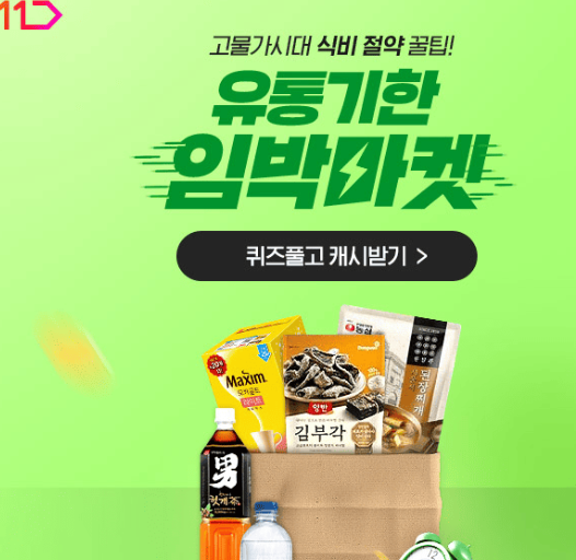 11번가 OO마켓을 들어보셨나요? 품질과 유통/소비기한에 이상이 없으나 유통/소비기한 OO, 과다 재고 등의 사소한 문제로 할인 판매하는 한정수량 할인 상품입니다! 지금 바로 구경 GO! OO에 들어갈 단어는 무엇일까요? 정답: 임박