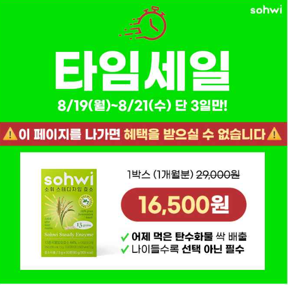 단3일 1+1 역대최저가후기 2,800개! 83만포 전량완판! 소휘 효소는 선택 아닌 필수! 수량소진시 조기종료! 어제 먹은 야식 탄수화물 죄책감 싹 분해! 소휘 효소는 한국인의 식습관에 맞추어 OOOO 분해효소의 활성도에 집중하고, 단백질의 분해효소의 균형을 맞추었습니다. 식후 1포 소화 습관으로 속편한 하루 되세요! 여기서 OOOO은?